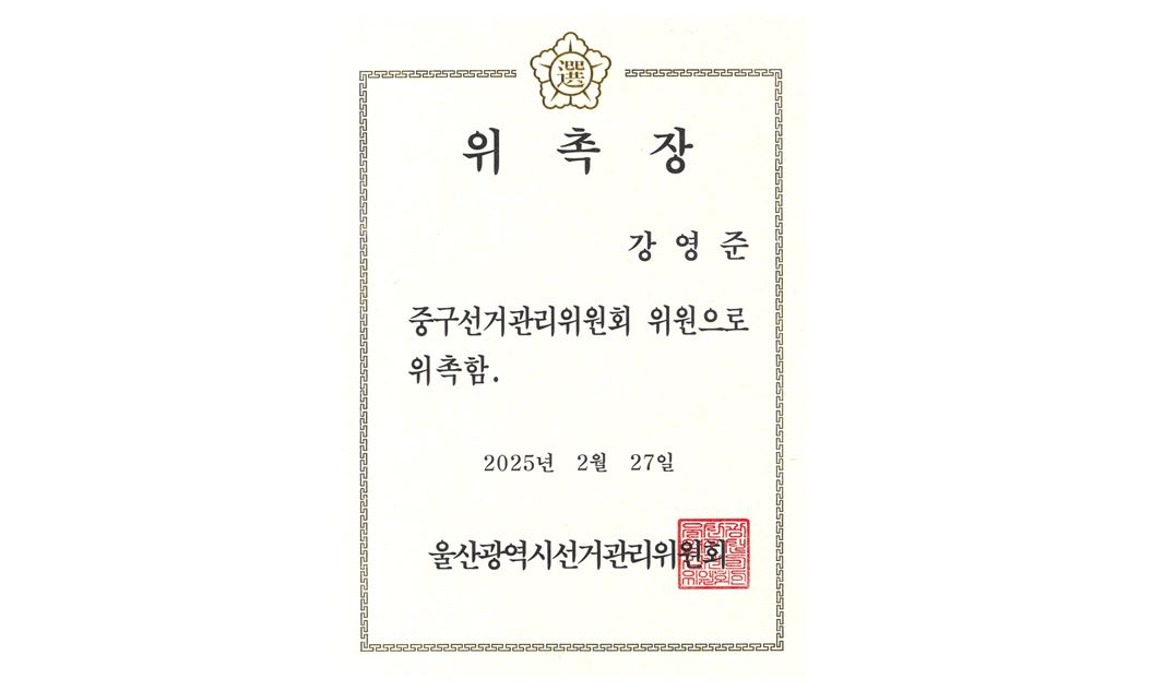 강영준 변호사님 중구선거관리위원회 위원으로 재위촉 되셨습니다.