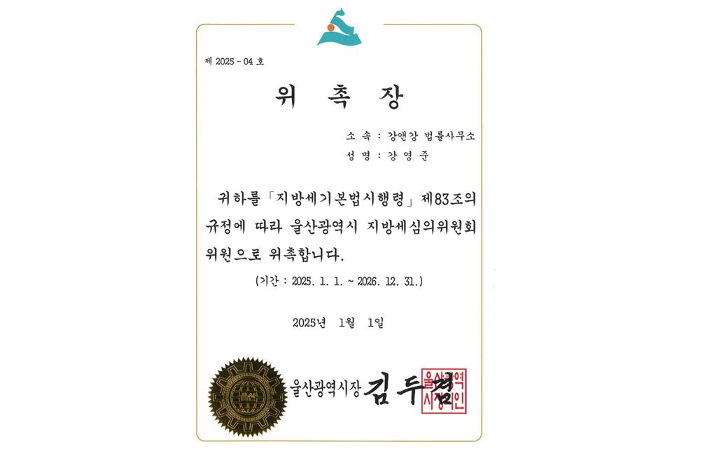 강영준 변호사님 울산광역시 지방세심의위원회 위원으로 위촉 되셨습니다.