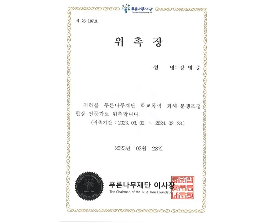 강영준 변호사님 (재)푸른나무 청예단 학교폭력 화해·분쟁조정 현장 전문가로 위촉 되셨습니다.