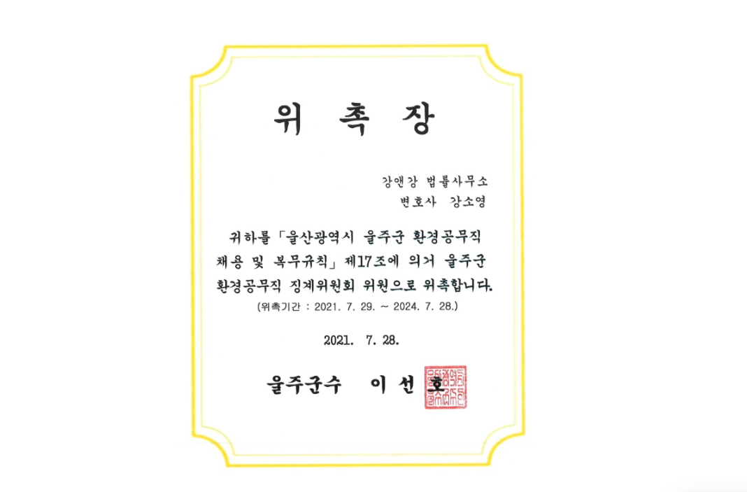 강소영 변호사님 울산광역시 울주군 환경공무직 징계위원회 위원으로 위촉 되셨습니다.