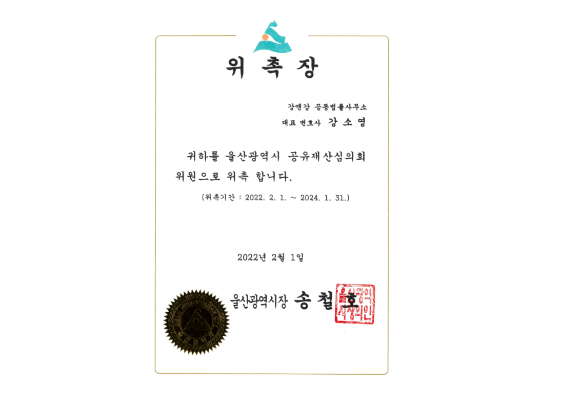 강소영 변호사님 울산광역시 공유재산심의회 위원으로 위촉 되셨습니다.