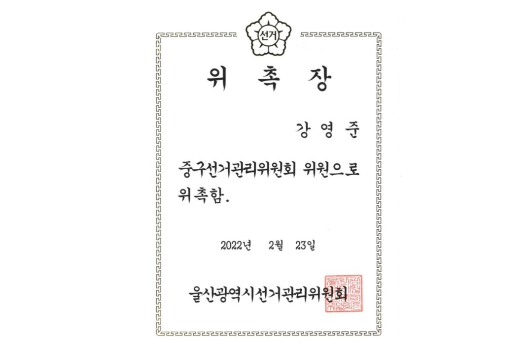 강영준 변호사 울산광역시 중구선거관리위원회 위원 위촉