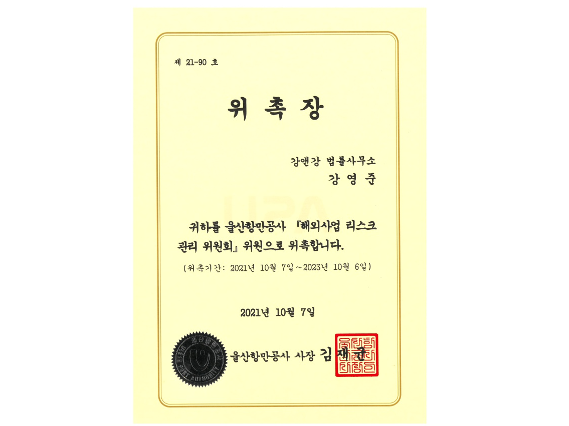 강영준 변호사님 울산항만공사 『해외사업 리스크관리 위원회』 위원으로 위촉 되셨습니다.