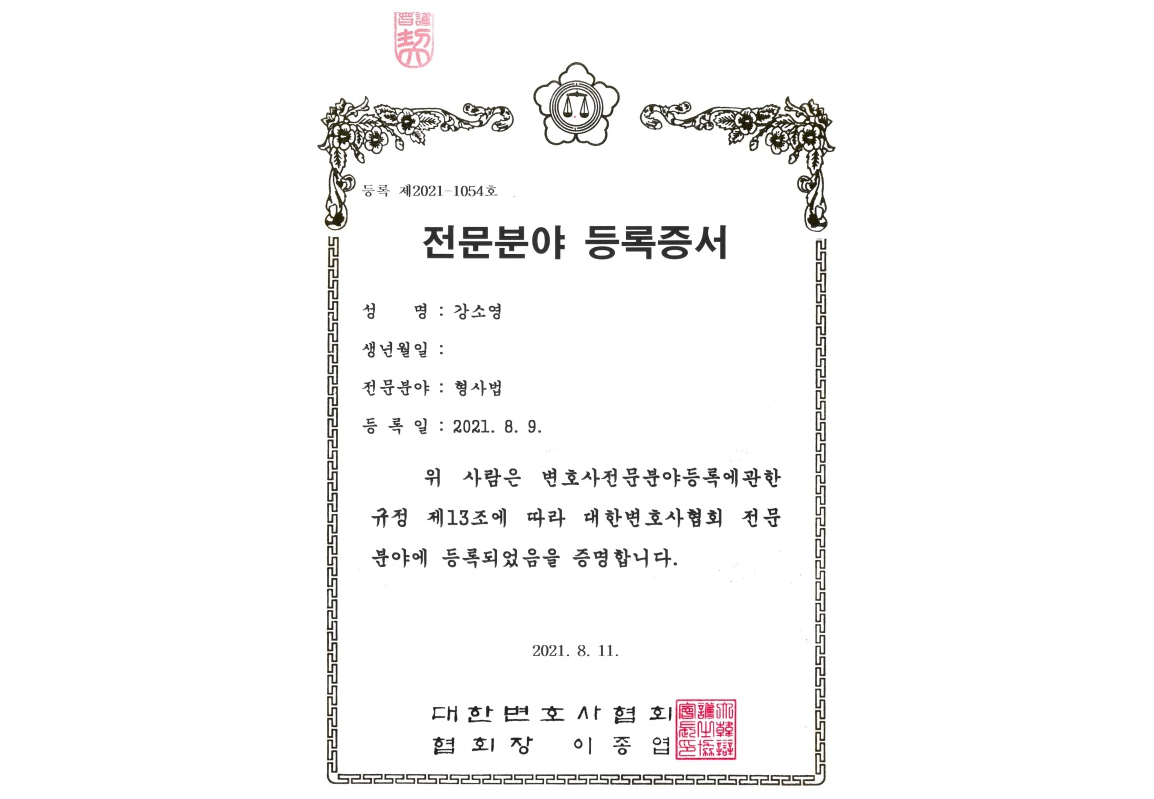 강소영 변호사님 "형사전문변호사"로 대한변호사협회에 등록 완료되었습니다.