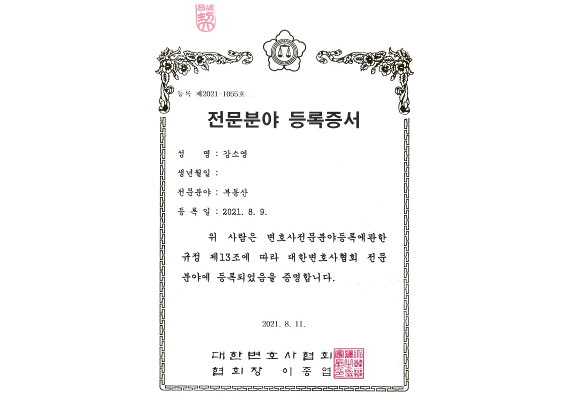 강소영 변호사님 "부동산전문변호사"로 대한변호사협회에 등록 완료되었습니다.