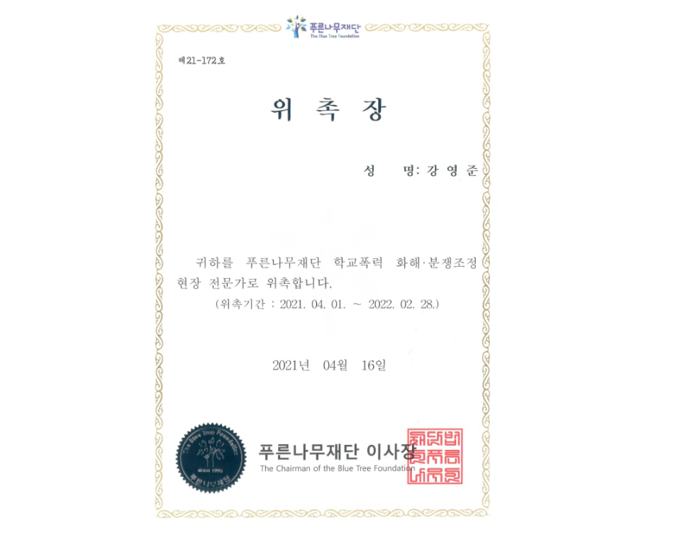 강영준 변호사 (재)푸른나무 청예단 학교폭력 화해 분쟁조정 자문위원 ...
