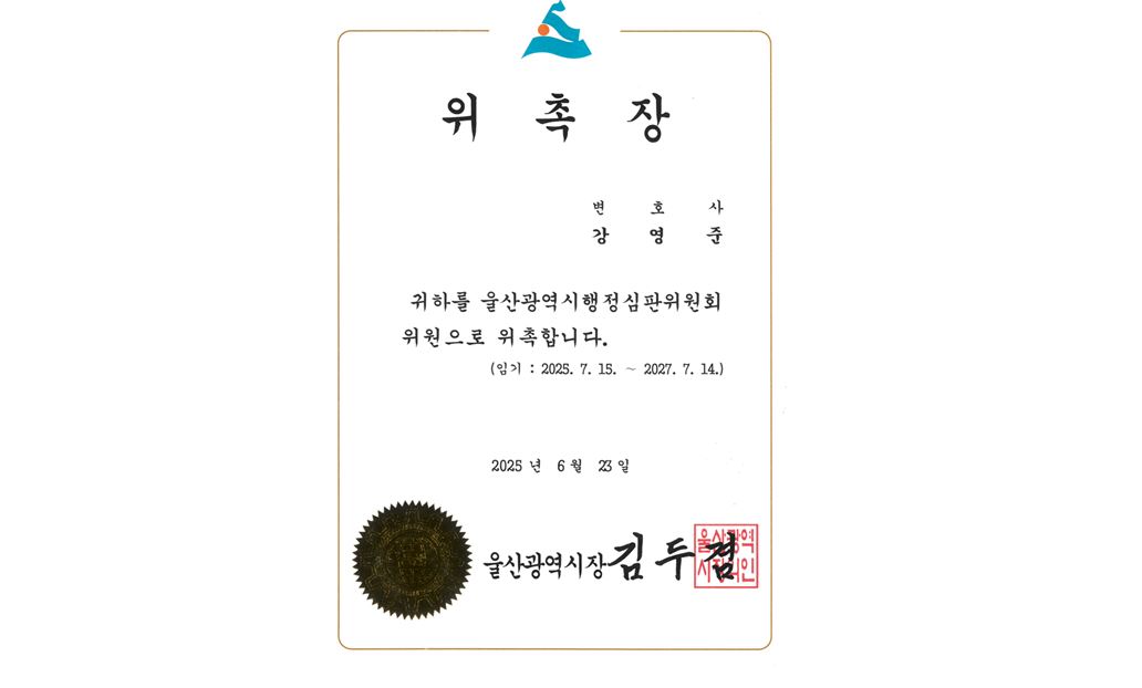 강영준 변호사님 울산광역시 행정심판위원회 위원으로 위촉 되셨습니다.