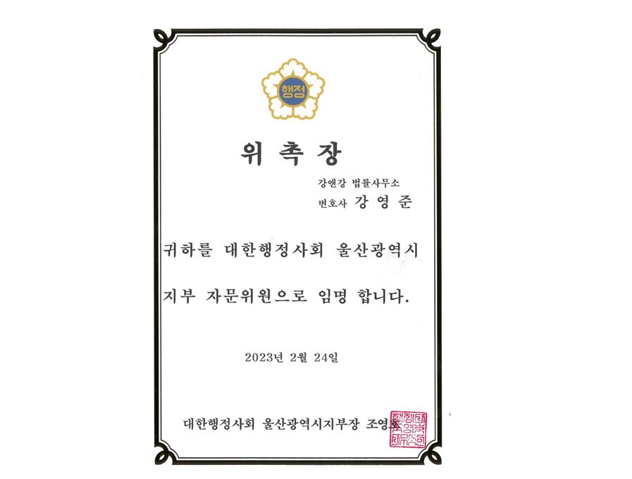강영준 변호사님 대한행정사회 울산광역시 지부 자문위원 임명 되셨습니다.