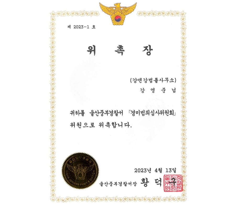강영준 변호사님 울산중부경찰서 경미범죄심사위원회 위원으로 위촉 되셨습니다.
