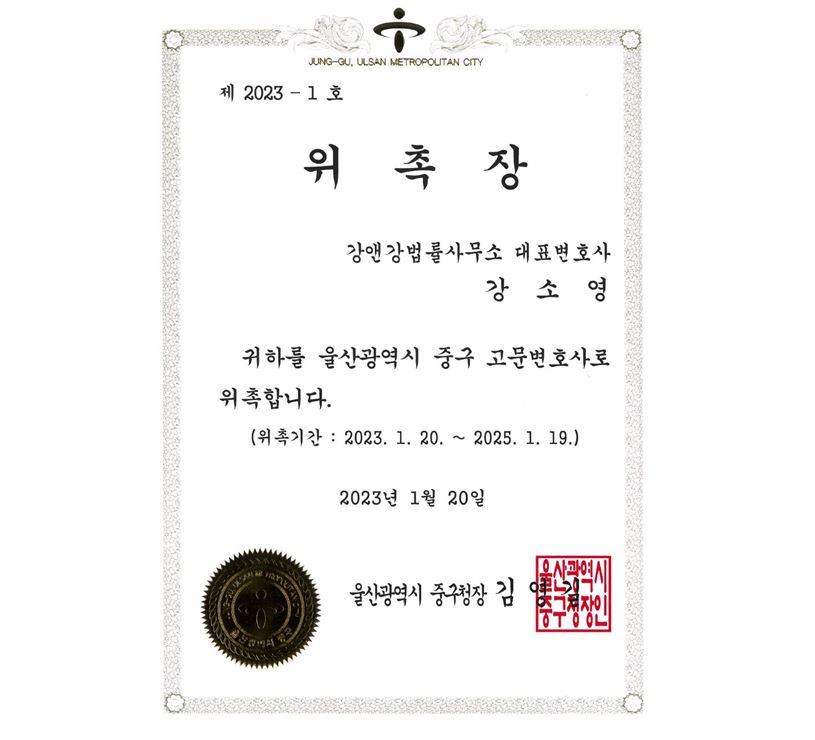 강소영 변호사님 울산광역시 중구 고문변호사로 위촉 되셨습니다.