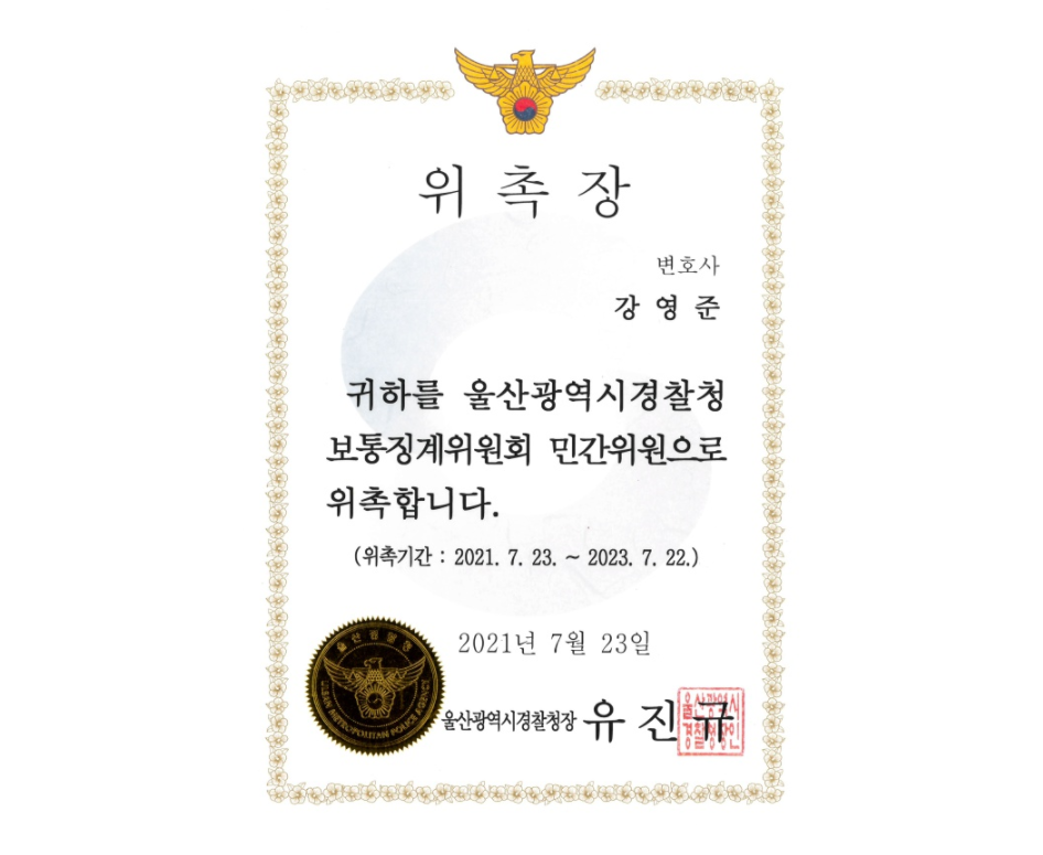 강영준 변호사님 울산광역시경찰청 보통징계위원회 민간위원 위촉 되셨습니다.